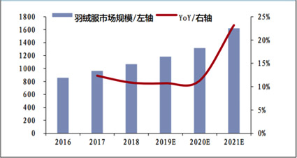 01羽絨服市場(chǎng)規(guī)模及增速(億元,%)